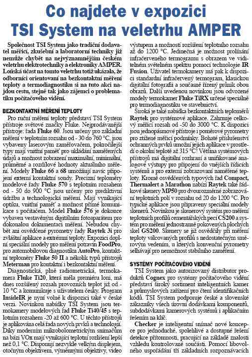 Společnost TSI System jako tradiční dodavatel měřicí, zkušební a laboratorní techniky již nemůže chybět na nejvýznamnějším českém veletrhu elektrotechniky a elektroniky AMPER. Loňská účast na tomto veletrhu totiž ukázala, že odborníci orientovaní na bezkontaktní měření teploty a termodiagnostiku si na tuto akci najdou cestu, stejně tak jako zájemci o problematiku počítačového vidění.