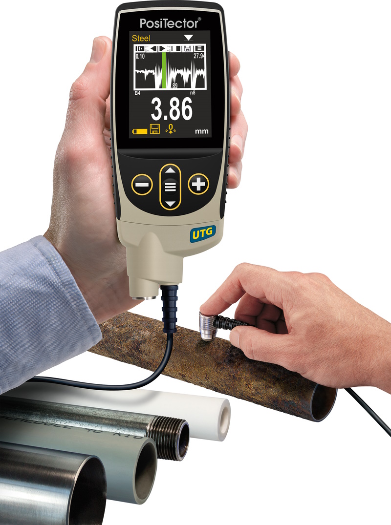 Připojením sondy k tělu přístroje vzniká PosiTector UTG - ultrazvukový tloušťkoměr od společnosti DeFelsko. Tento přístroj měří tloušťku stěn materiálů pomocí ultrazvukové technologie. Je ideální pro měření účinků koroze nebo eroze na nádrže, potrubí nebo jakoukoli strukturu, kde je přístup omezen na jednu stranu. Využít lze předprogramované režimy pro běžné materiály nebo snadno zadejte svůj vlastní. Režim Min Scan - provádějte nepřetržité čtení a zaznamenávejte minimální/maximální tloušťky - ideální pro rychlou inspekci.