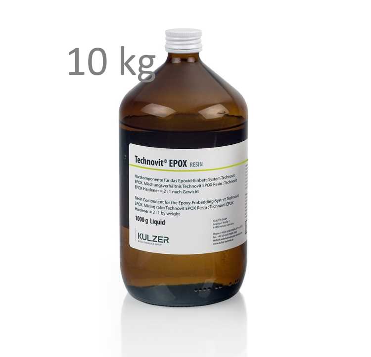 Technovit EPOX je dvousložková epoxidová hmota (prášek : tvrdidlo, poměr míchání 2:1 ), která je po vytvrzení vysoce transparentní.